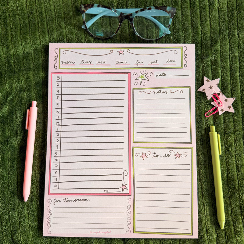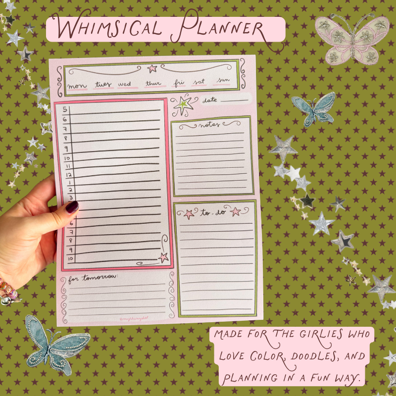 A whimsical weekly planner made to keep your days a little more fun and a lot more organized. Simple, cute, and easy to use. Perfect for planning your week at a glance, writing reminders, or just keeping your life together in a cozy way.